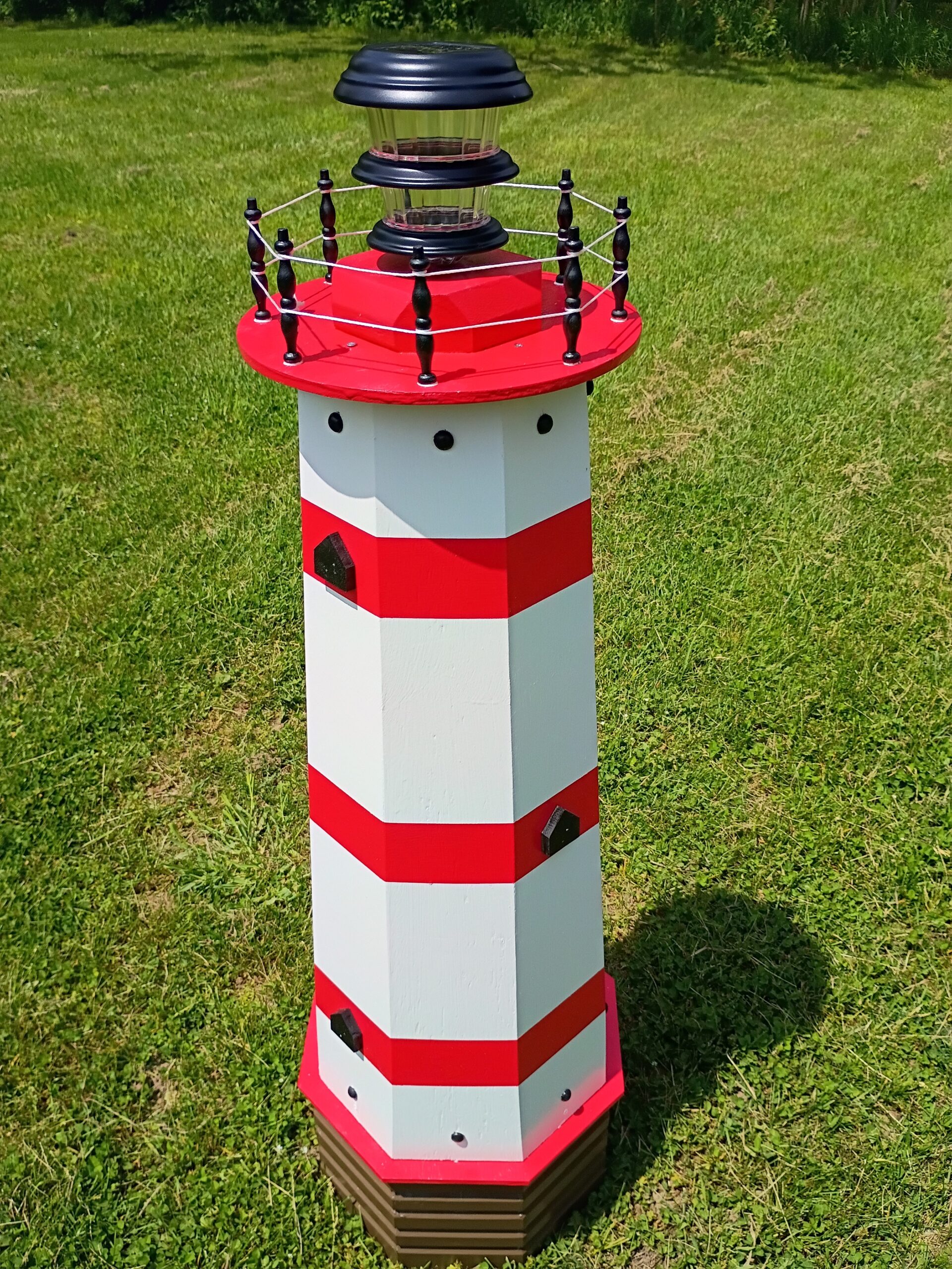Lighthouse well pump cover with solar light decorative lawn and garden handmade outdoor ornament – 4 feet tall – red stripes